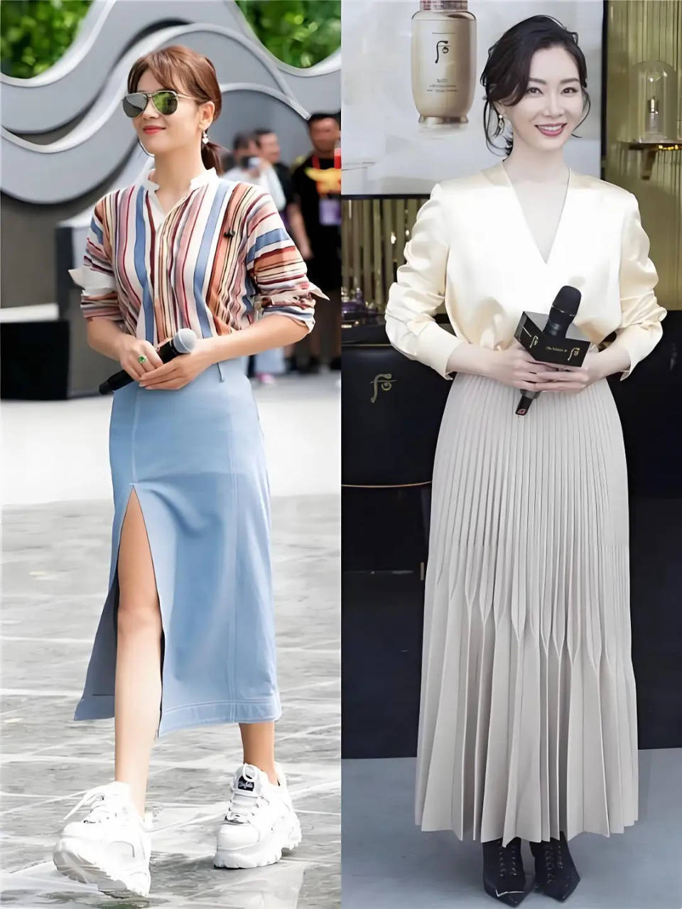 下面,刘涛和陈数的两套穿衣打扮有的不同,刘涛是用印花的条纹衬衫搭配上雾霾蓝的开叉直筒半身裙,这样的色彩搭配会更精致,更显年轻。