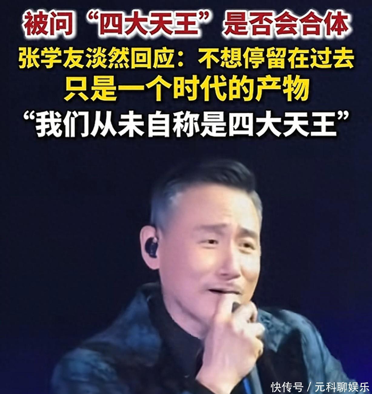 1�号晚,张学友接受港媒采访,大概的意思,小编简单的给大家整理一下:1:反问记者,你想不想见到一个都老了的四大天王。2:四大天王只是那个时代下的产物,早就已经过去了,现在根本没有四大天王这件事了。3:现在大家都在忙各自的事业。4:我不想停留在过去,而且我们自己没有叫自己是四大天王。5:四大天王这个称号,只不过是当时媒体的炒𱦞:希望这个称号保留在那个时代,不愿意去破坏那份美丽的回忆。
